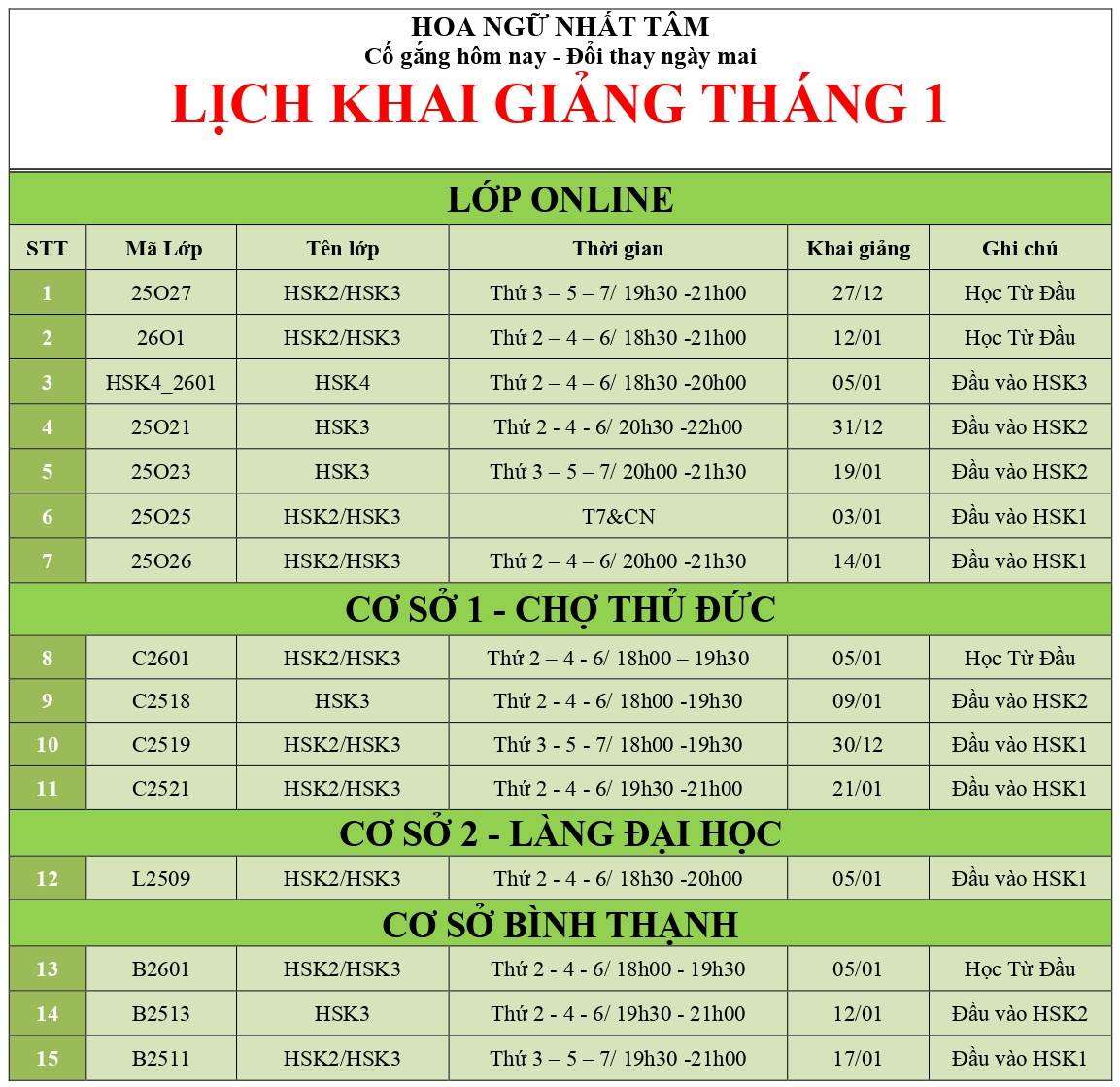 LỊCH KHAI GIẢNG THÁNG 1.2026